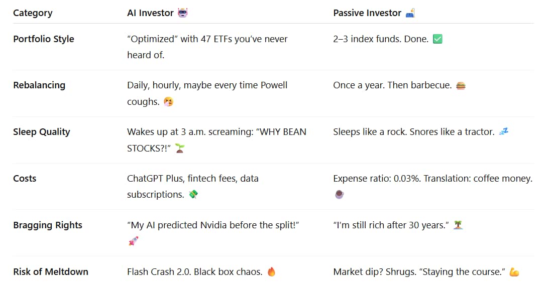 Meme Table: AI Investor vs. Passive Investor 💡 So What’s the Move?Here’s the truth bomb: AI won’t replace the boring beauty of “set it and forget it.” Jack Bogle’s ghost is still laughing from the Vanguard headquarters. But AI can help: