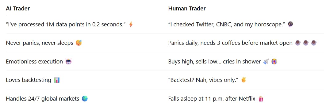 đ¤ AI vs. Human Trader Meme Table đđ Winner? Neither alone. The dream team = Human + AI. Funny Quips (Because Finance Needs a Laugh)