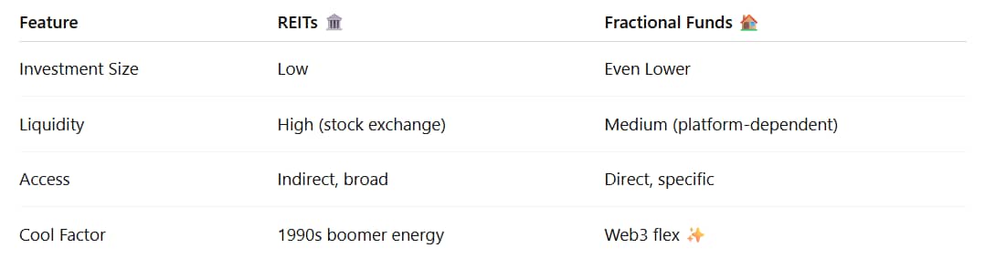 Or as FinTech Futures put it: “Tokenization of real estate assets is revolutionizing the industry, offering increased liquidity and accessibility.” 💡 REITs vs Fractional Funds: Meme Mode Activated 💥👉 TL;DR: REITs are your reliable Toyota Corolla. Fractional funds? A shiny Tesla with autopilot. Still being tested, but sexy as hell. The Catch (Because There’s Always One) 😏Before you throw your life savings in faster than Elon tweets 🚀🐦: