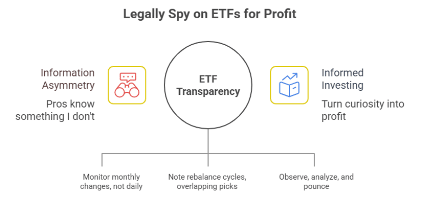Ever felt like the financial world is an exclusive nightclub where the bouncers only let hedge funds in while youâre outside, nose pressed against the glass? đ¸ Meanwhile, the âprosâ seem to sip champagne while youâre stuck with tap water. Well, grab your trench coat and cue the Mission Impossible music đśâbecause today, Iâm going to show you how to legally spy on ETFs and use their own transparency against them. No hacking. No shady back-alley deals. Just good olâ fashioned public information. As Peter Sondergaard of Gartner said: âInformation is the oil of the 21st century, and analytics is the combustion engine.â In our case, that âoilâ is ETF holdings dataâand the combustion engine is you, turning curiosity into profit. đ Pain Point #1: âThey Always Know Something I Donât!âLetâs be realâit stings. You jump into a stock after CNBC hypes it up, and two minutes later it tanks. Meanwhile, ETFs and big funds seem to ride rainbows straight to profit land. đ đĄ Solution: ETFs are required by the SEC to disclose their holdings. Thatâs rightâWall Street literally hands you their playbook. Sure, thereâs a lag (sometimes days, weeks, or quarterly), but that lag is your legal spy window. đ Itâs like watching your friend post vacation pics after theyâre backâexcept youâre using the pics to predict where theyâll book their next trip. âď¸ Pain Point #2: OverwhelmâToo Many ETFs, Too Little BrainpowerWith ETFs for everythingâAI, clean energy, space, pet care đâitâs like Netflix for stocks: endless choices, analysis paralysis. đĄ Solution: Donât try to track them all. Pick 2â3 âtrendsetterâ ETFs in your niche. Look at their top 10 holdings. Thatâs where the real juice is. Funny quip: âWhy did the ETF cross the road? To diversify its portfolio!â 𤣠Pain Point #3: FOMO Flu (Fear of Missing Out)We all know that one smug friend who bought Tesla at $40. Donât be the person who almost caught the wave. đĄ Solution: ETFs rebalance on predictable cyclesâquarterly, semi-annual, or after index changes. If you track those dates, you can position yourself just before they buy (or sell). Thatâs not FOMOâthatâs FOM-YES. đŻ Pain Point #4: ConfusionâETF Data Looks Like Ancient HieroglyphicsEver open an ETF holdings PDF and close it faster than a bad Tinder profile? ISIN codes, weightings, sector pie chartsâugh. đĄ Solution: Ask simple spy-worthy questions: