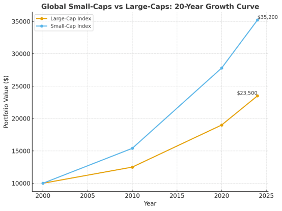 These are the scrappy underdogs, the financial ninjas, the ones who quietly deliver while everyone else is glued to CNBC worshipping big tech. 🥷 Infographic: The Aha! Moment 📊Global Small-Caps vs Large-Caps: 20-Year Growth Curve ➡️ Visual takeaway: $10k in small-caps grew to $35,200 while large-caps lagged at $23,500. That’s the power of going global small. 💥 (Source: MSCI World Small-Cap vs MSCI World Large-Cap historical fact sheets) Actionable Advice 🛠️