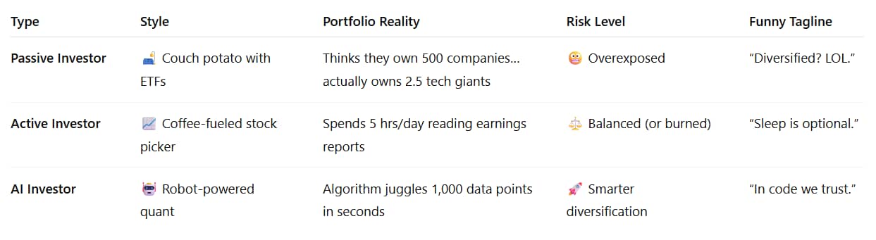 That’s called concentration risk. Translation: if Apple catches the flu, your portfolio might need NyQuil 🤒. 🦄 The “Passive” Aggressive TruthETFs feel safe because they’re automatic. But automatic ≠ immune. It’s like showing up at a buffet 🍗🍕🥗 and realizing 70% of the dishes are just chicken wings. Delicious? Yes. Balanced? Not even close. As Charlie Munger once quipped, “Diversification is protection against ignorance. It makes very little sense for those who know what they’re doing.” The question is: are you actively choosing your mix, or blindly following the herd? (And let’s be honest… sometimes the herd goes over a cliff 🐑➡️⛰️). 💸 Why This MattersIf your retirement portfolio = “just ETFs,” you might be dangerously overexposed. If Big Tech sneezes, your future nest egg might end up on life support. 🥚➡️🚑 This isn’t fear-mongering. It’s about awareness. Remember Blockbuster? Nokia? (If you’re under 30, ask your parents. Netflix, but with late fees and human interaction 😅). Giants can fall. Investor Types at a Glance🎨Choose wisely. Your future self will thank you. 🔑 What You Can Do (Without Freaking Out)